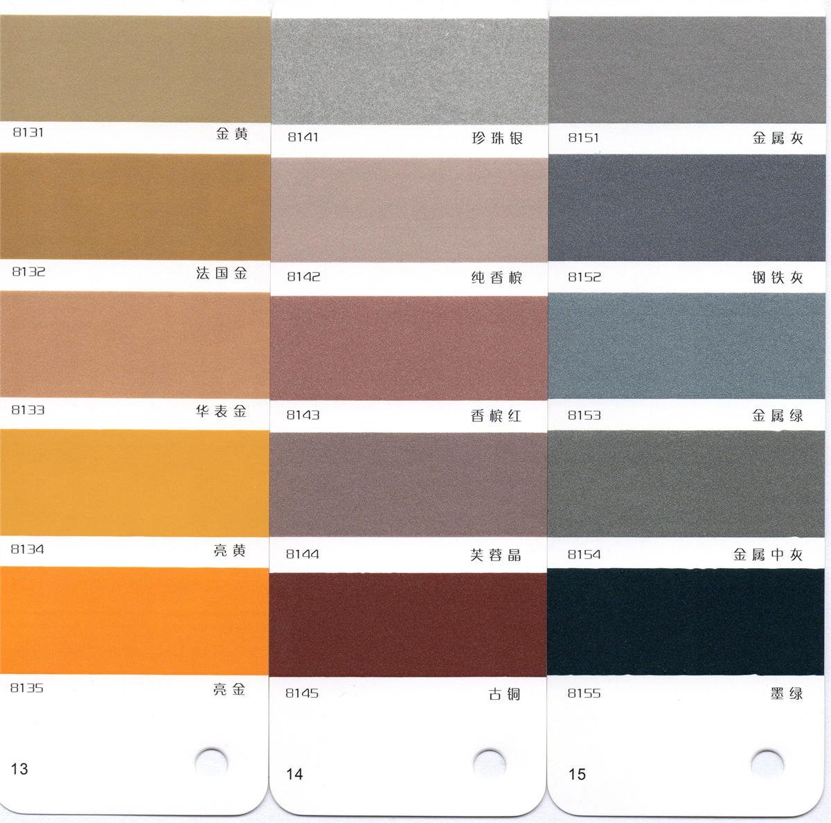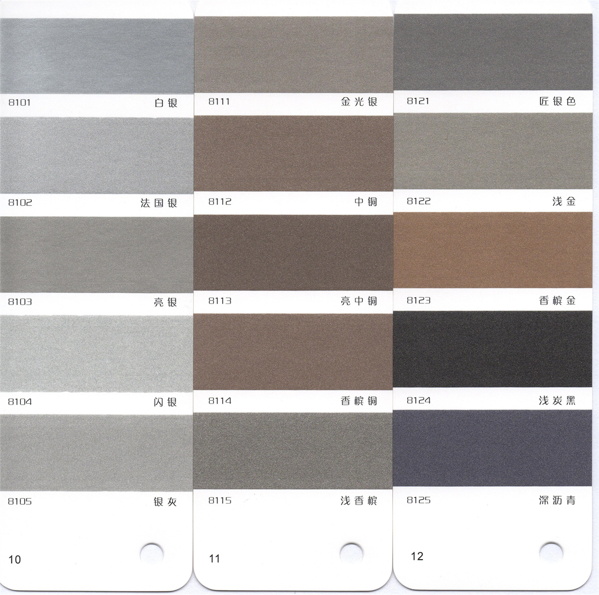 友情告知:以下氟碳漆顏色包含金屬質(zhì)感,由于圖片無法呈現(xiàn)實(shí)際效果,以及顯示器分辨率不同,此電子色卡只作為色系的參照物,具體顏色請咨詢?nèi)蛎赓M(fèi)服務(wù)熱線:400-007-0957